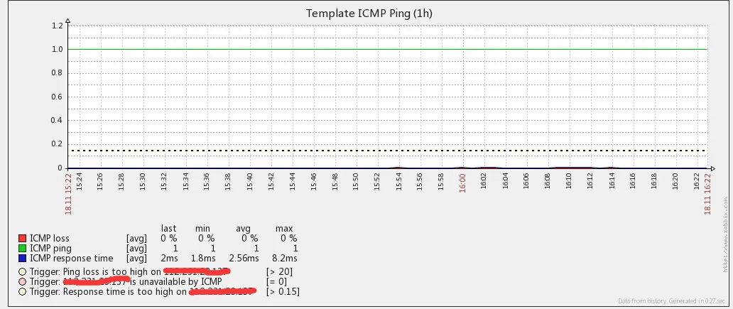 公司使用了三线接入,联通.电信.移动最近发现一个问题,有时候网站经常打不开,或者打开的速度很慢,查找原因发现三线之中的一条线路丢包很严重,打客服电话官方回答“线路受到非法攻击,技术人员正在解决”。还好用的是三线,直接dnspod把出问题的线路解析关掉,果然一切正常了。于是问题来了,怎么才能及时发现哪条线路出问题呢,这里我们介绍下使用zabbix icmp-ping监控网络状态的配置。