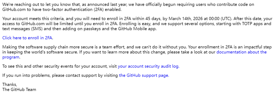 笔者近期收到了GitHub官方的通知邮件,要求用户启用双因素[身份验证](2FA)。