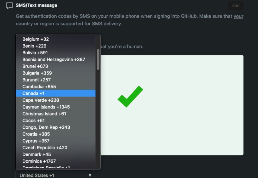 于是我点击邮件中的 Click here to get started 按提示尝试开启 2FA。相信很多小伙伴都会选择使用[短信][验证码]作为 2FA 的验证方式,我们点击 SMS/Text message 后面的 Add 按钮,通过人机验证后,再选择国家或地区代码并填写手机号,随即尴尬地发现: