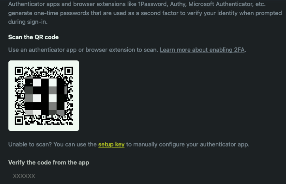 然后点击左下角的“已验证 ID”,再点击“扫描 QR 码”,扫描 登录 GitHub 后 里的二维码,将生成的 code 填入到验证框点击“save”即可。