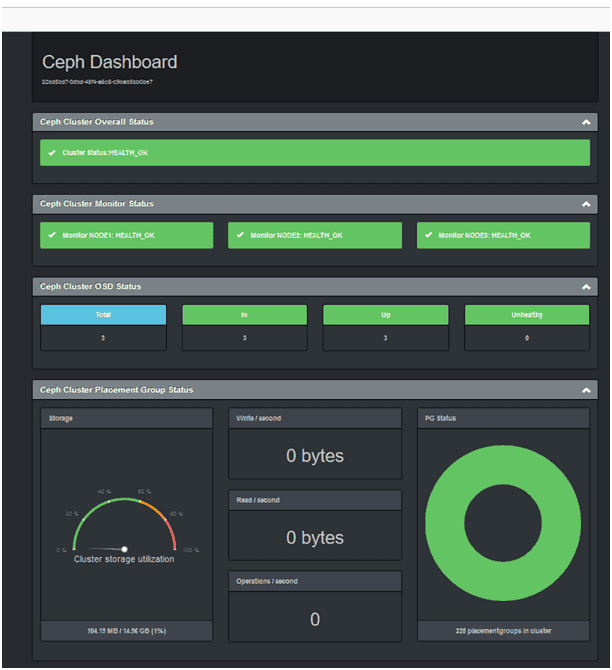 简介: ceph-dash 是用 Python 开发的一个 Ceph 的监控面板,用来监控 Ceph 的运行状态。同时提供 REST API 来访问状态数据。 安装部署: 1:进入安装目录 cd /root/ 2:下载软件包 git clone https://github.com/Crapworks/ceph-dash.git 3:进入下载软件包文件夹 cd ceph-dash/ 4:后台启动ceph-dash,日志输出到ceph集群一个文件夹 python ceph-dash.py >/root/cephdash.log 2>&1 & 5:访问页面,查看信息: http://你的IP:5000/