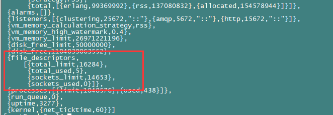 在系统中执行“rabbitmqctl status”,可以看到file_descriptors和sockets的详细信息,如图: