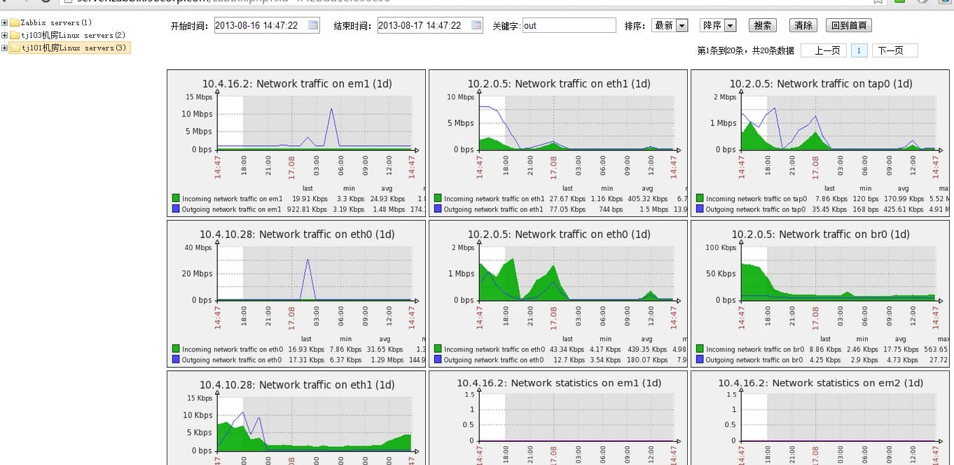 zabbix3.2安装graphtree3.0.4 一、Graphtree功能概述 1、集中展示所有分组设备 2、集中展示一个分组图像 3、集中展示一个设备图像 4、展示设备下的Application 5、展示每个Application下的图像 6、展示每个Application下的日志 7、对原生无图的监控项进行绘图   二、安装及配置 1、环境安装要求 Zabbix软件版本:zabbix3.2.11 操作系统:CentOS release 7.4   2、graphtree安装及下载 cd /var/www/html/zabbix wget —no-check-certificate  https://raw.githubusercontent.com/OneOaaS/graphtrees/master/graphtree3.0.4.patch yum install -y patch patch  -Np0 <graphtree3.0.4.patch chmod -R 777 oneoaas/   ###这里需要服务写入权限     3、重启apache服务 systemctl restart httpd 效果如下 4、删除3.0.4广告信息: vim /var/www/html/zabbix/oneoaas/templates/graphtree/graphtree.tpl