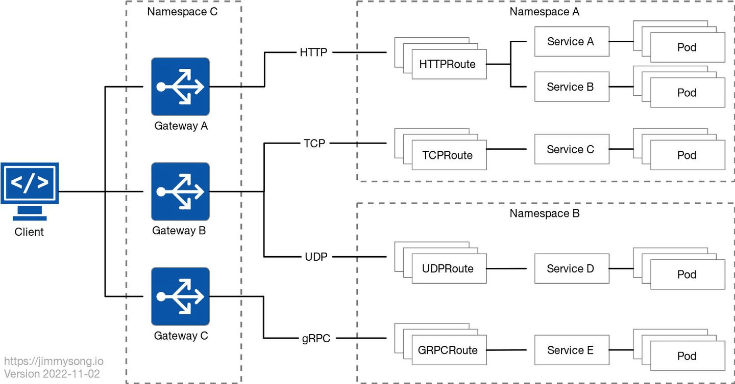 Ingress 的配置过于简单,仅支持 HTTP 协议路由; HTTP 路由仅支持 host 和 path 匹配,对于高级路由功能没有通用配置,只能通过 annotation 来实现,比如使用 Nginx Ingress Controller 实现 URL 重定向,需要配置 nginx.ingress.kubernetes.io/rewrite-target annotation,已经无法适应可编程路由的需求; 不同命名空间中的服务要绑定到同一个网关中的情况在实际情况下经常出现,而入口网关无法在多个命名空间中共享; 入口网关的创建和管理的职责没有划分界限,导致开发者不仅要配置网关路由,还需要自己创建和管理网关; Kubernetes Gateway API Gateway API 是一个 API 资源的集合 —— GatewayClass、Gateway、HTTPRoute、TCPRoute、ReferenceGrant 等。Gateway API 暴露了一个更通用的代理 API,可以用于更多的协议,而不仅仅是 HTTP,并为更多的基础设施组件建模,为集群运营提供更好的部署和管理选项。