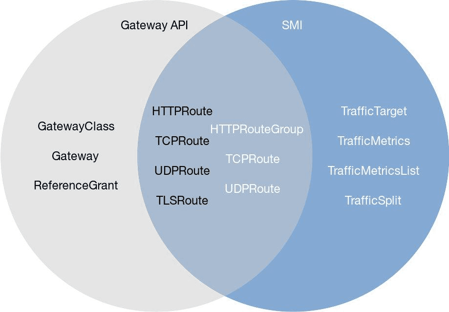 从图中我们可以看到 Gateway API 与 SMI 在流量规范部分有明显的重叠。这些重叠导致同样的功能,需要在 Gateway API 和服务网格中重复实现。